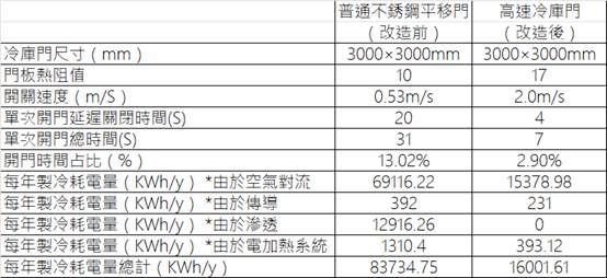 测试数据表明,改造一樘冷库门每年可节约用电67733.14度,降幅达80%。其中因空气对流造成的能量损耗占每年能耗的82.5%,占比最大,降低此部分的能耗效果也最明显。因此,提高门的开关速度,减少开门时间是最有效的方案。